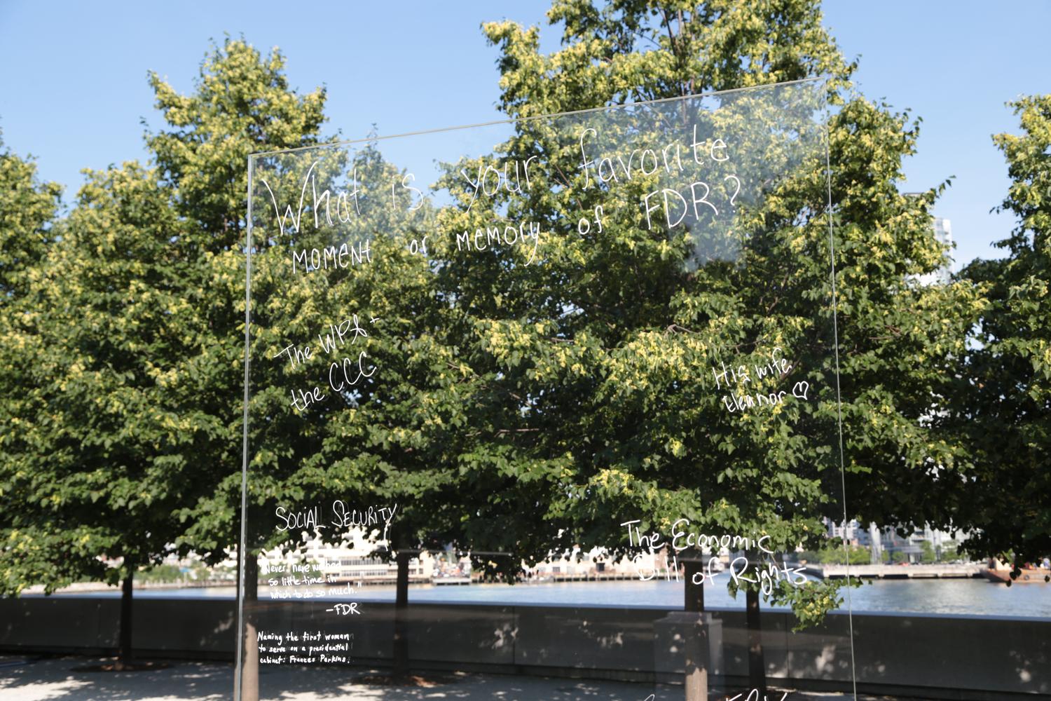 For this event, I designed two Acrylic Writing Walls. The director and I wanted the walls to spark discussion between participants, so they were custom built to face directly across from one another in the lawn lounge. The walls were assembled on site, and the setup included a white pillar with directions and white paint markers.