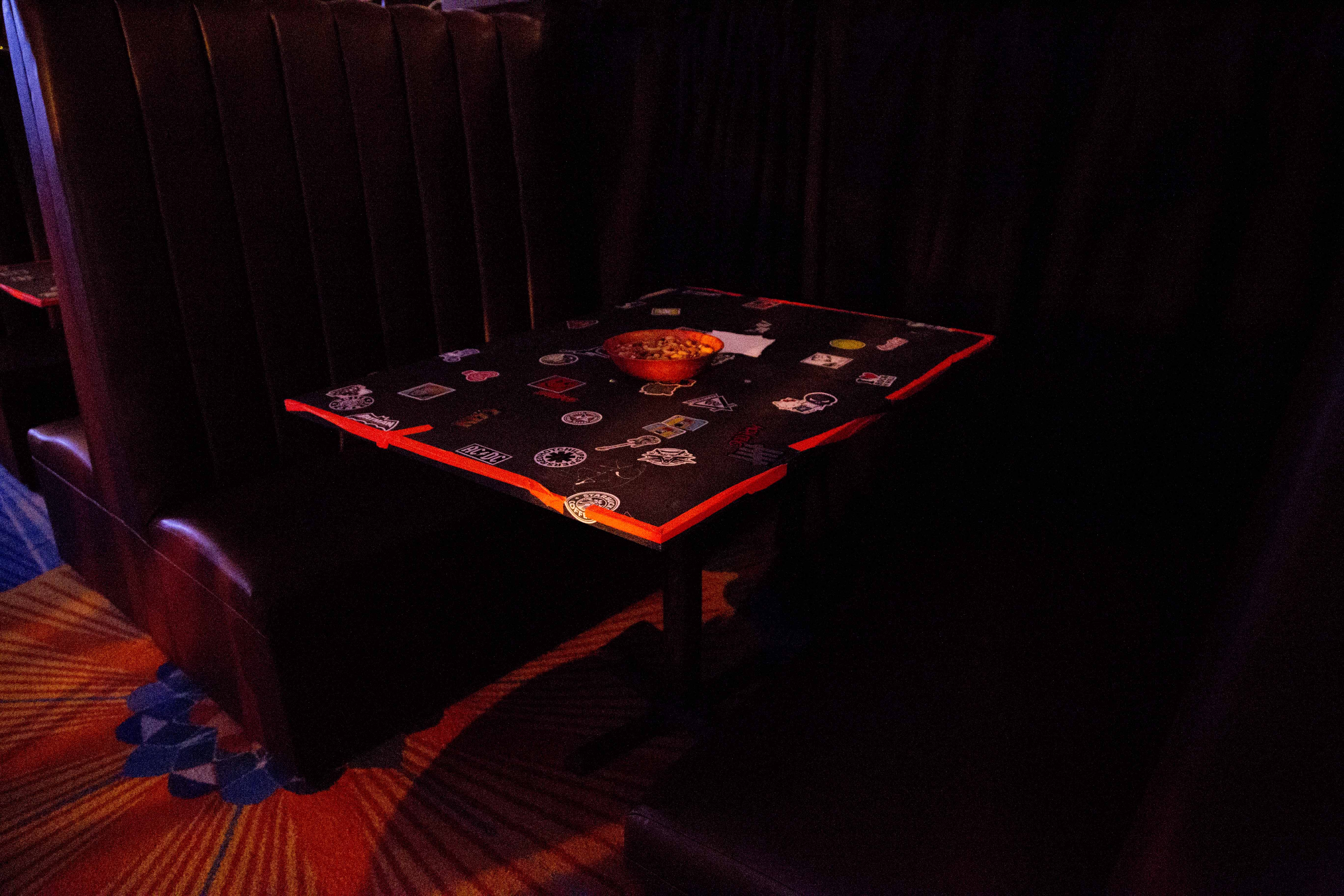 Dive Bar Décor: Restaurant booths & black tables with tape and band stickers