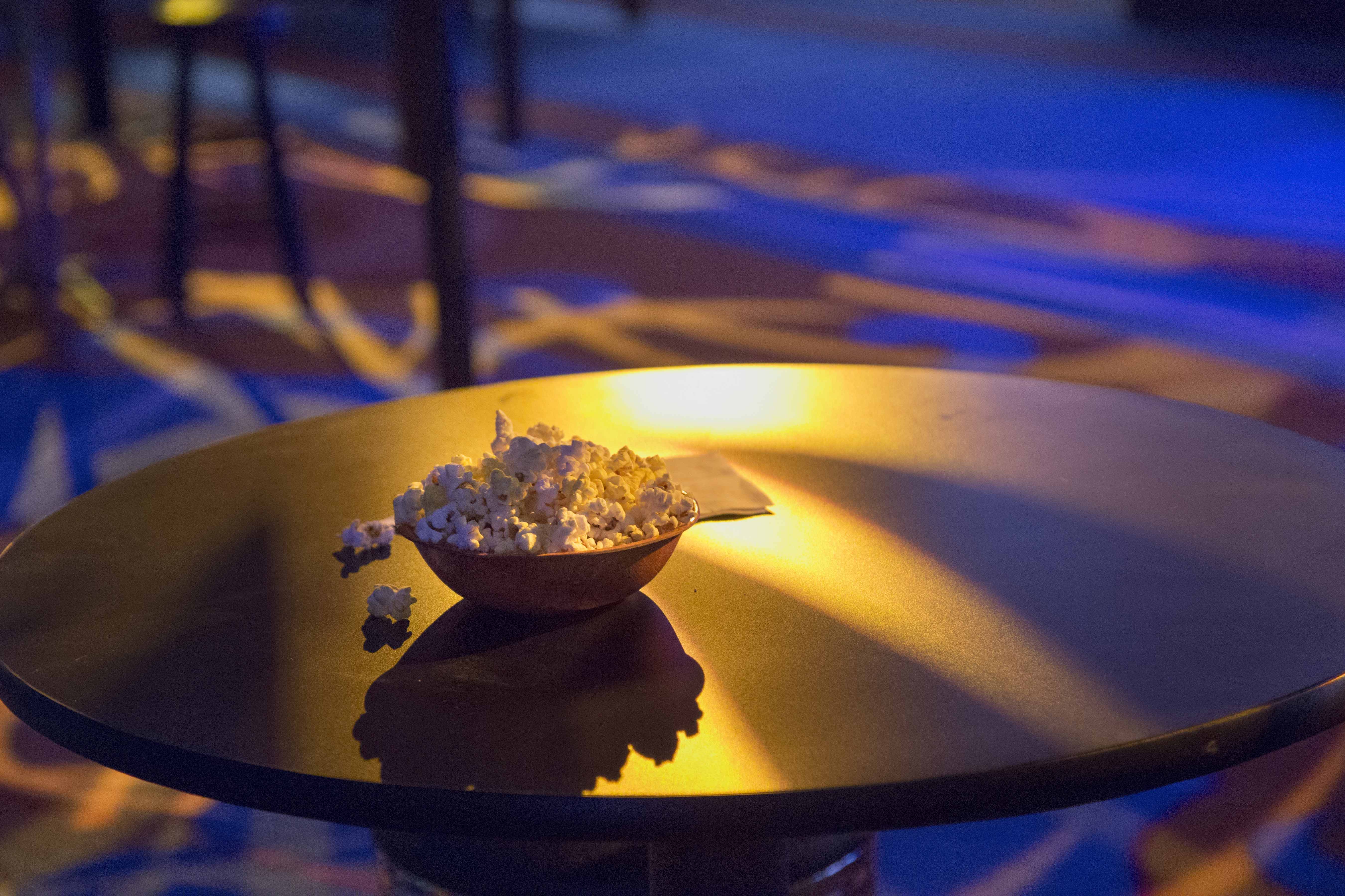 Dive Bar Décor: Round black bar tables with popcorn & mixed nuts